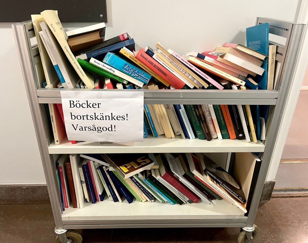 Nej, vi verkar inte leva i en värld där vagnarna med gratis böcker eftertraktas och plundras undan för undan. Säkert plockas en och annan titel som fortfarande kan tilltala, men alltför förlegade och nischade lämnas kvar. Det återspeglar säkert i viss mån att professorer som gått i pension har hunnit utveckla andra intressen än studenter oftast får på grundnivå, men vi ser också en del förskjutningar i stort. Svenska som forskningsämne har genomgått omfattande förändringar, särskilt de senaste decennierna. Även om områden som ordbildning och språkhistoria fortfarande lever får de nu samsas med diverse inriktningar som rör språk i bruk (eng: applied linguistics) och ofta är tvärvetenskapliga – som diskursanalys, samtalsanalys, andraspråksutveckling, läskunnighet och andra didaktiska frågor med mera. På kursen jag läste i text- och interaktionsforskning i Göteborg i vintras slogs jag av hur många avhandlingar i svenska från de senaste tio åren som använt etnografiska och sociokulturella utgångspunkter för att förstå sina material. Systemfrågor dominerar inte utan intressen har vidgats till att studera människorna och de sociala sammanhangen runt språket. Text och kontext, säger en del.