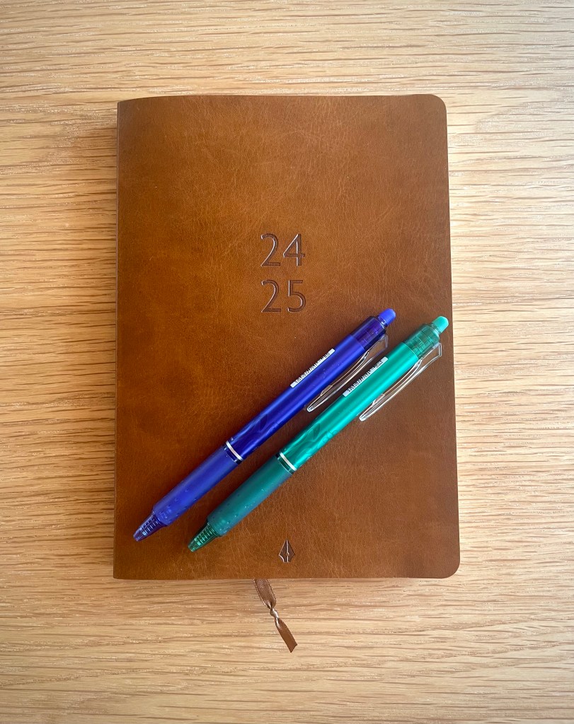 Jag har försökt gå över till digital kalender, mer än en gång. På vissa sätt vore det ju praktiskt, med gemensamma inbjudningar och digitala möten – och att dela kalendern med kollegor eller anhöriga. Men i min nuvarande tjänst sköter jag i hög grad mig själv, och framför allt har jag aldrig lyckats vänja mig vid att gå över helt och hållet till digitala verktyg för att planera min tid. Det kräver för många klick och jag får liksom ingen överblick av vad jag gör med mitt liv utan tror alltid att jag kommer att missa och glömma saker. Kanske kommer det att ändras i framtiden, när funktionerna och gränssnitten blir vassare – jag anser mig vara digitalt intresserad och kunnig på många sätt, så varför inte anamma det här också? Men kanske finns vissa saker jag aldrig kommer att vilja digitalisera. Jag minns det jag skriver för hand bättre (stämmer med forskning). Mina ögon mår bättre av att inte bara titta på skärmar (stämmer med forskning). Jag mår bra av att använda vackra saker i min vardag (stämmer med forskning) – och att investera i gedigna redskap behöver inte vara en extravagans utan istället ett löfte till en själv.